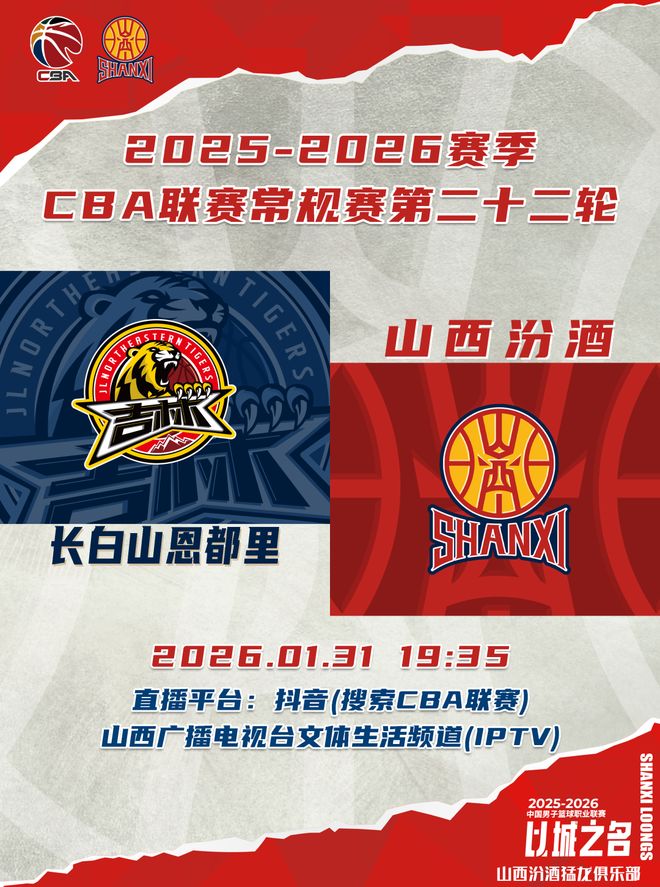 北京时间2026年1月31日19:35,2025-2026赛季CBA联赛常规赛第22轮继续进行,山西汾酒客场挑战长白山恩都里,球迷观众可以通过抖音(搜索CBA联赛)、山西广播电视台文体生活频道(IPTV)观看比赛实况,与草莓视频官网在线观看一同为山西汾酒男篮加油助威!