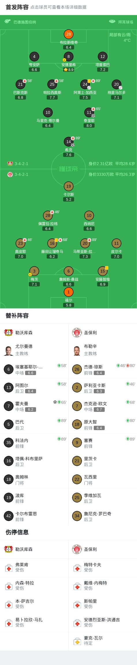 北京时间2月4日德国足协杯 1/4决赛,勒沃库森对阵圣保利。上半场勒沃库森泰里耶破门首开记录,下半场希克破门扩大比分,随后格里马尔多助攻霍夫曼破门再下一城。最终比分勒沃库森 3-0 圣保利。