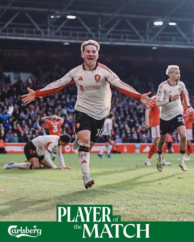 利物浦官方宣布,麦卡利斯特当选球队与诺丁汉森林一役队内最佳球员。